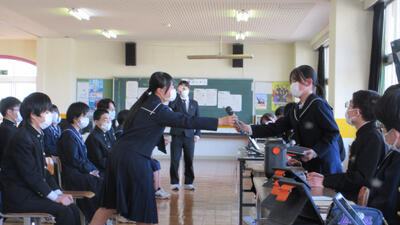 資料の準備や会場の設営、片付け、会の運営を行ってくれた生徒会本部役員と委員会役員のみんなです。役員のみんなのおかげで、全校生がしっかりとした気持ちで生徒会総会に臨むことができました。ありがとう!