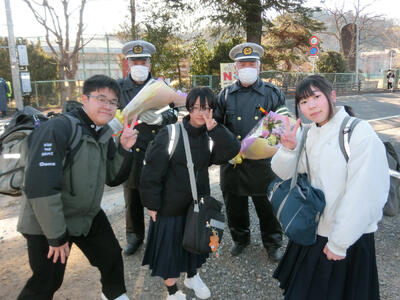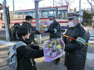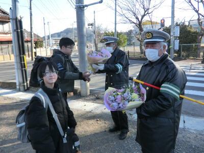 毎朝、学校前の交差点で生徒を見守り、交通指導をしてくださっている安達さん、佐藤さんへ、卒業生から感謝のことばと花束贈呈を行いました。卒業生を3年間見守っていただき、ありがとうございました。