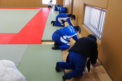 ↑寒い廊下を黙々と雑巾がけしています。
